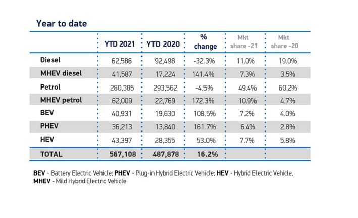 As you can see from the screen shot below, new registrations for all-electric cars (BEV) have again grown Year To Date; from 19,630 in 2020 to an astonishing 40,931 in 2021; a huge 108.5% increase.